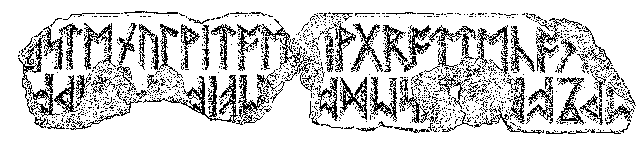 In a previous issue of ZM it was revealed that among the small amount of ancient Jameldic literature that has survived to the present day there exists the Saga of Jorthel, which was discussed in detail in our last issue, and also a short inscription in a runic script. It is this inscription which appears below. We regret the poor quality of the reproduction, but unfortunately it is not possible to provide a photograph, since the stone exists in two discrete halves which reside in different museums (typical), in both of which photography is forbidden (totally typical). Therefore, it is an artist's impression which appears here. (Well, he said he was an artist.)